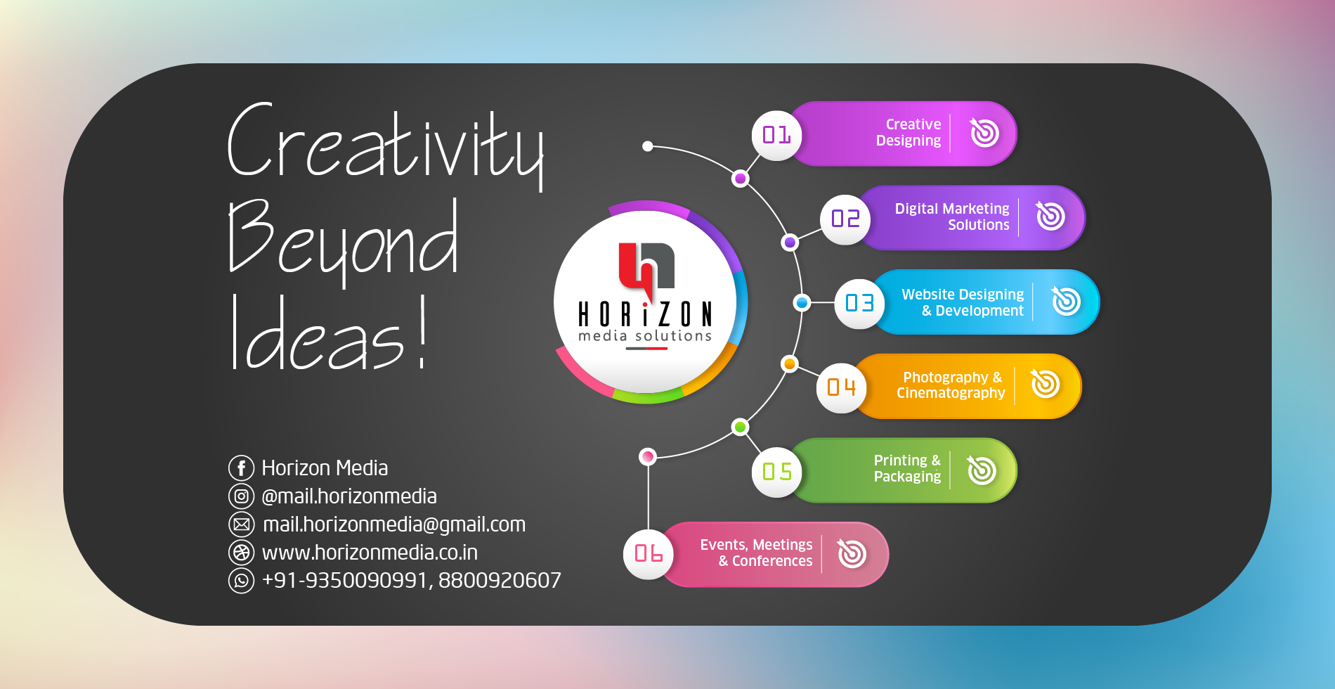 If you are someone who is looking at setting up or expanding your brand and wishes to make the right noises for heads to turn, you need not look any further. With more than 20 years of combined experience in varying media fields, we at Horizon Media Solutions are here to bridge the gap between you and your end-users. Our team will understand your requirements and study the industry to offer you valuable business inputs on client needs and market trends. We provide new-age solutions to creative design, digital marketing, website design and development, printing and packaging services. We make sure your brand remains a cut above the rest and meets all customer requirements.